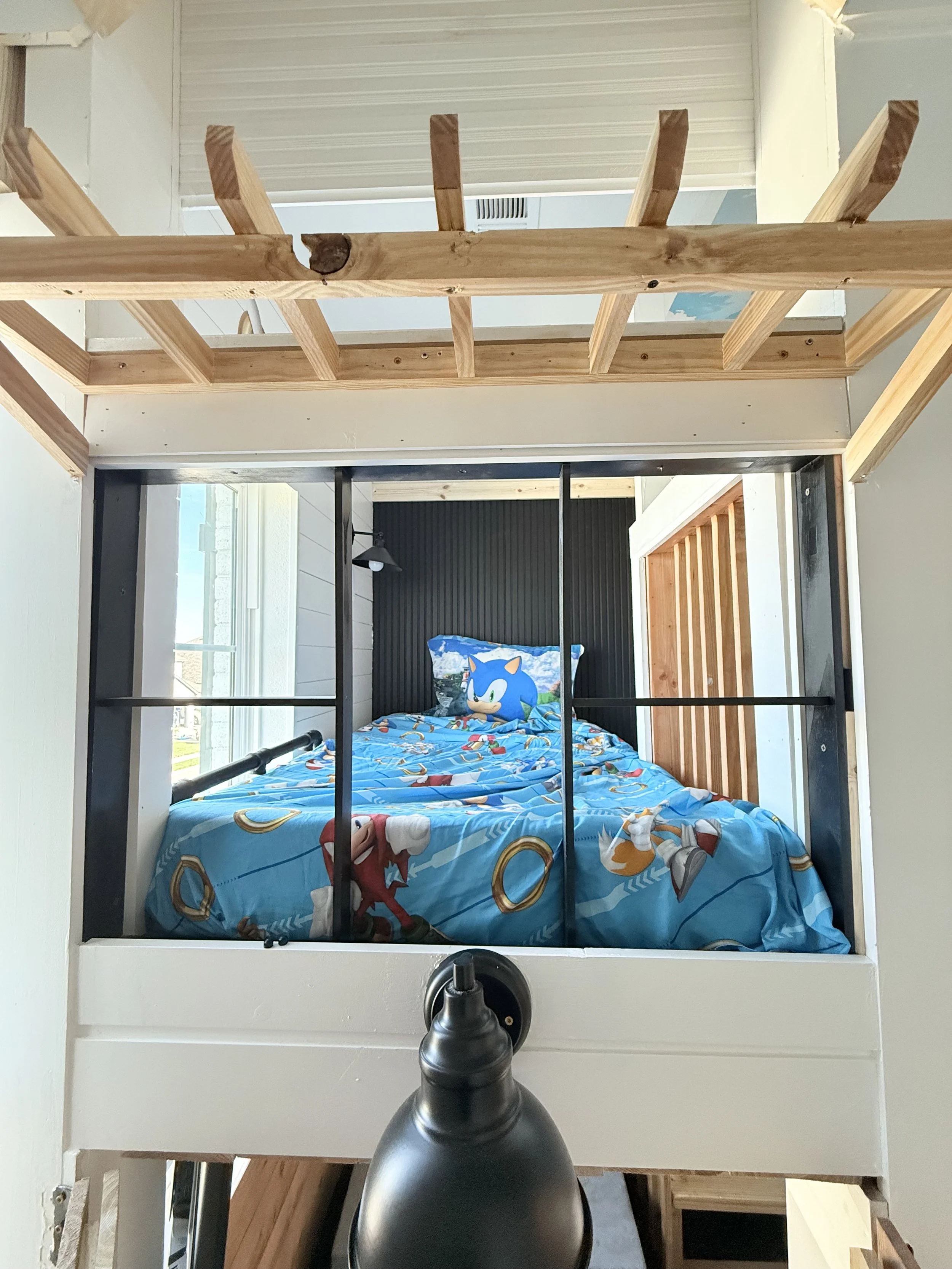 This farmhouse bunk bed design embraces rustic charm while maximizing space and comfort. The goal was to create a multi-functional piece that fits seamlessly into the aesthetic of a cozy farmhouse, while also catering to the adventurous spirits of four grand boys.